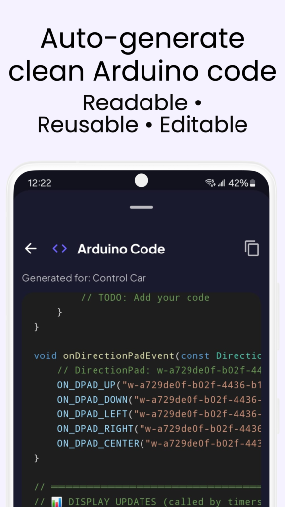 Instant IoT generates clean, readable Arduino code — no cloud, no account required.